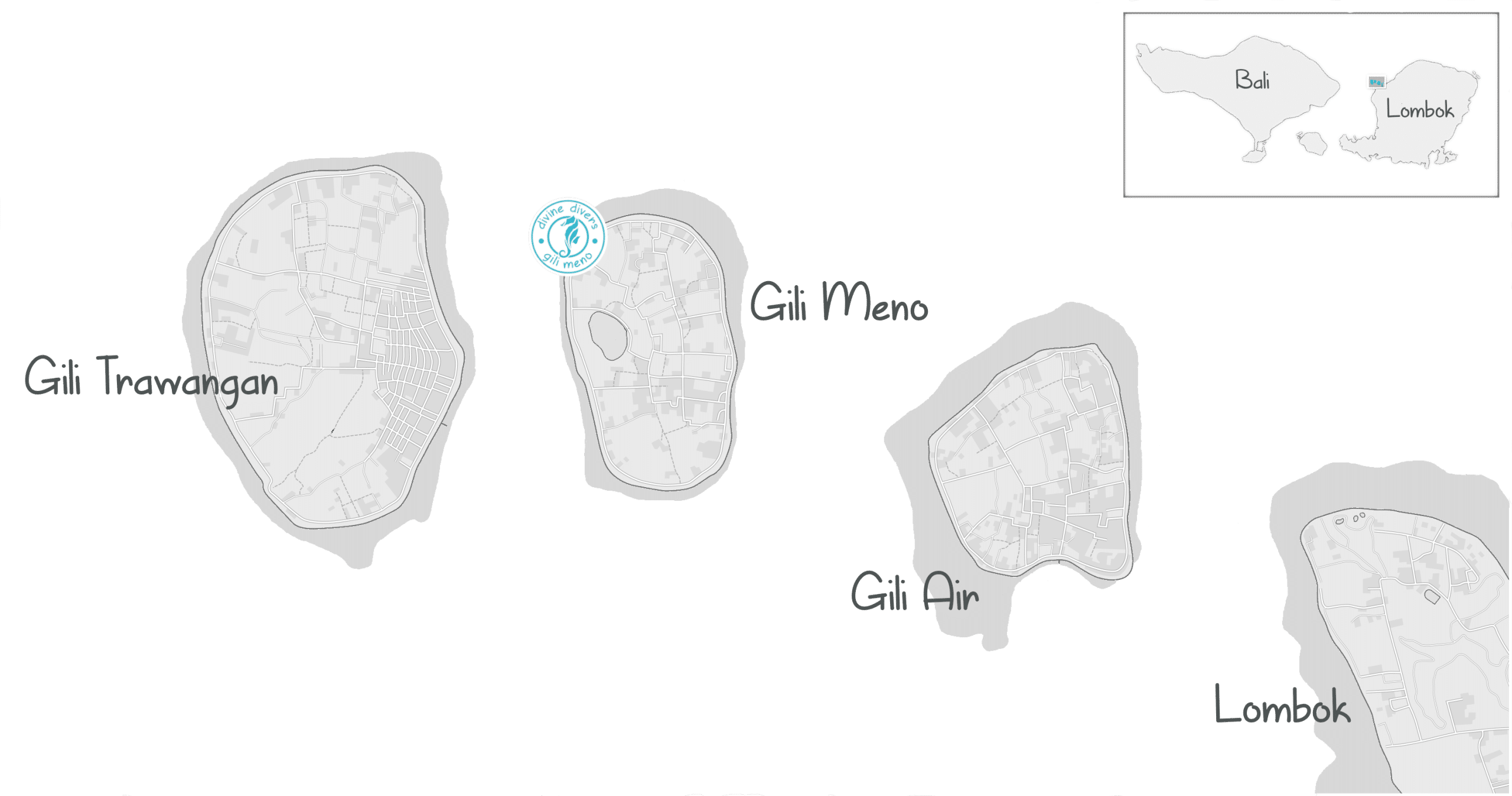 Divine Divers is located in the North West of Gili Meno whereas the main harbor is in the South East. Gili Meno as well as the two other Gilis have banned motorized transport. You get around by walking, cycling or per horse cart. Bikes can be hired either for an hourly or daily rate, the cidomo horse carts charge you according to distance and walking is of course free. Best is to agree on the price before you hire and friendly haggling always helps. Â Please expect a 20 to 25 minutes leisurely walk to get from the harbour to Divine Divers.
