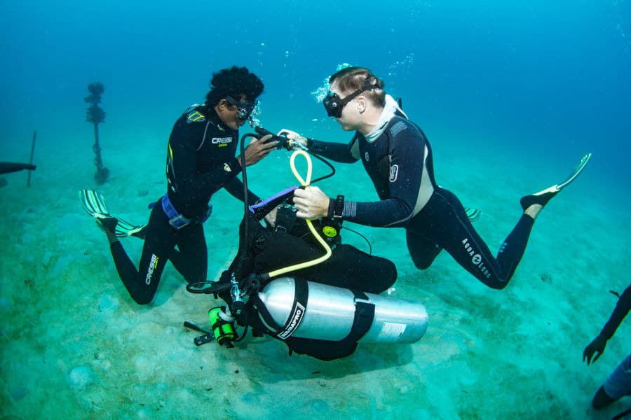 And finally, you will take part in the legendary equipment exchange—a true test of communication and teamwork. You and your buddy will swap all pieces of scuba gear while underwater, sharing a single regulator throughout the exercise.